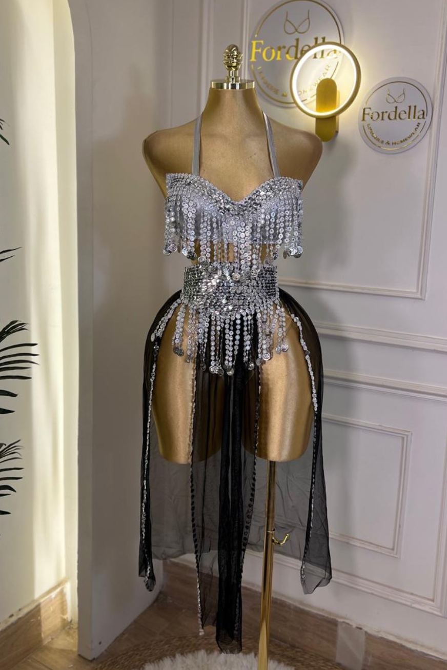 Plongez dans l'élégance et le mystère avec cet envoûtant ensemble de danse orientale, composé de deux pièces. Ce costume est une célébration du chic moderne, alliant la brillance de l'argent étincelant à la profondeur sophistiquée du noir intense.